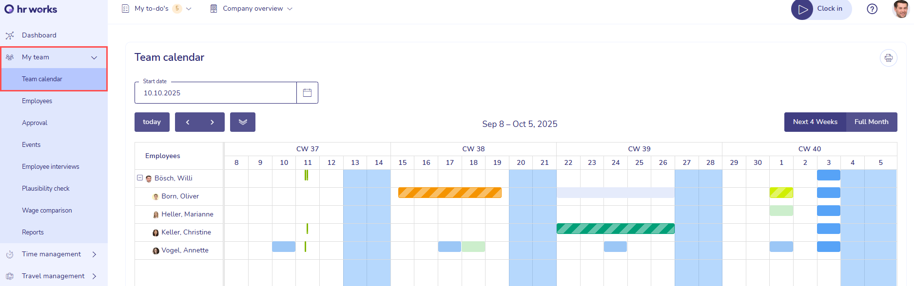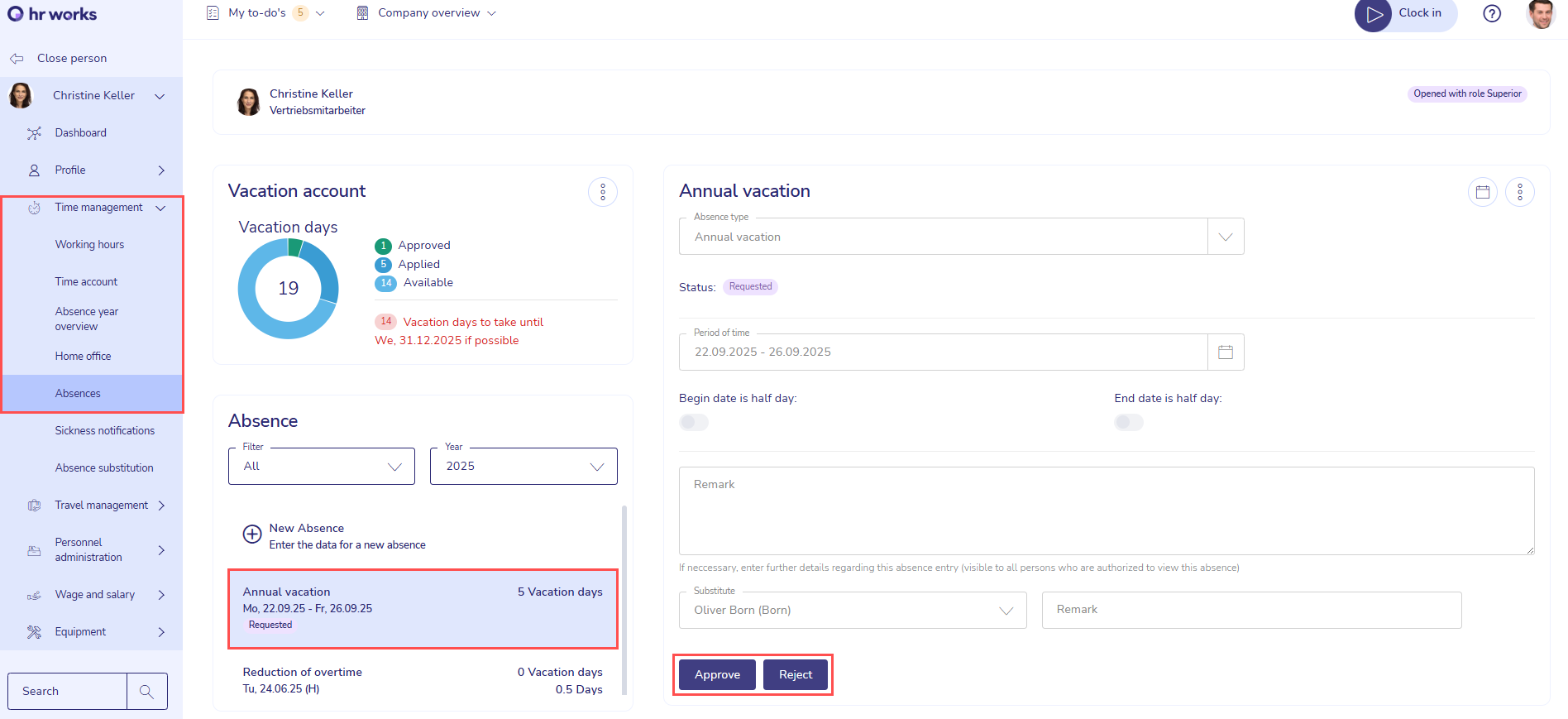 Under ‘Time Management/Absence Year Overview,’ you will find a basic overview of the entire year, including the employee’s absences, travel, substitutions, and more. If the absence affects the employee’s time account, you can view the current status under ‘Time Management/Time Account.’