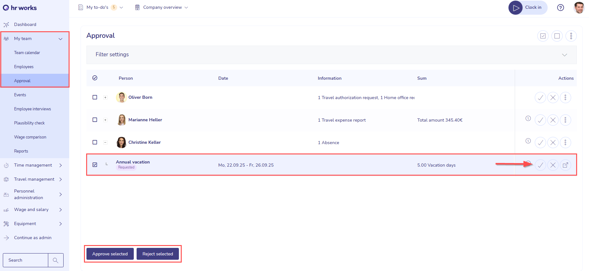 In your user interface, you can approve all submitted requests in the ‘My Team/Approval’ menu. This section provides the most important information about each request.