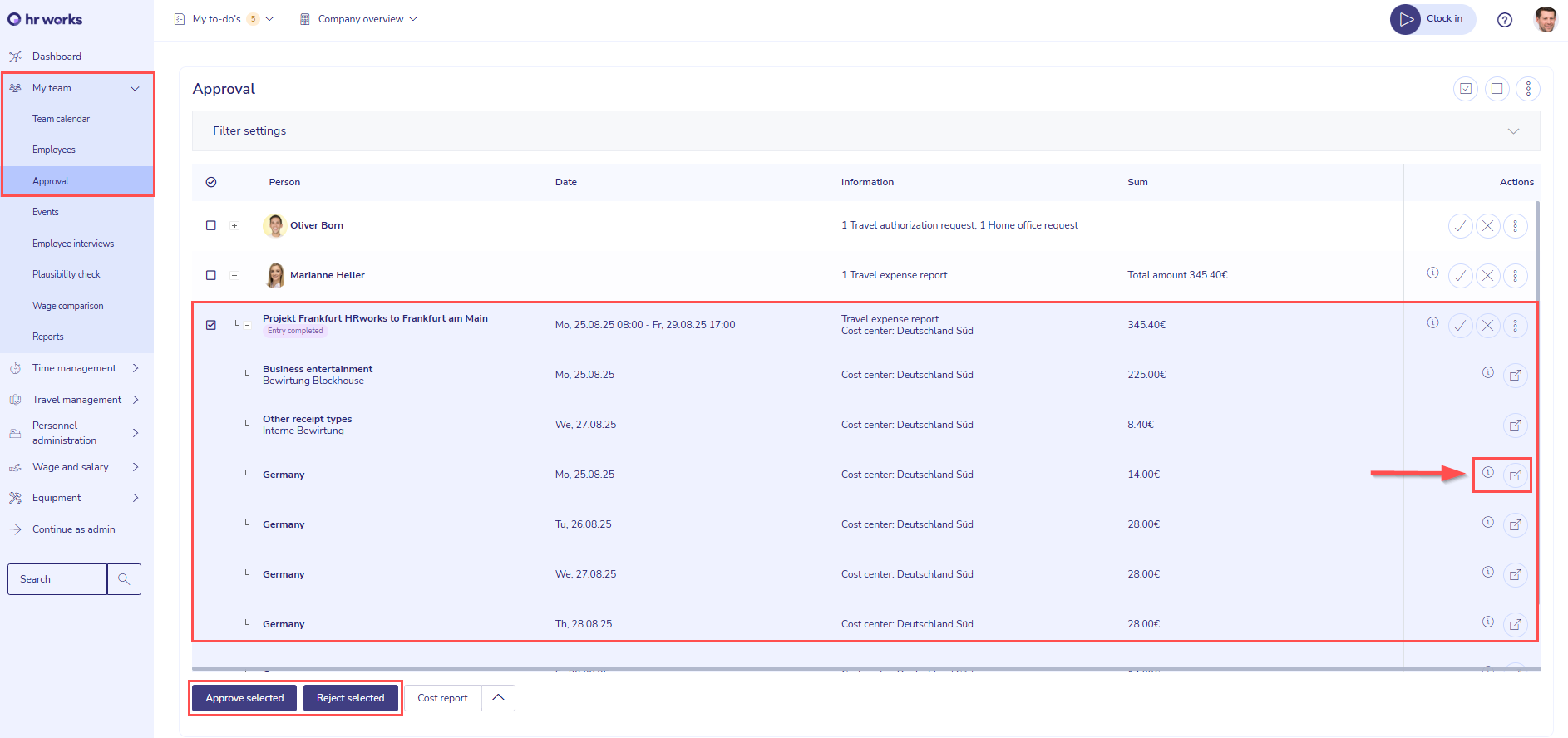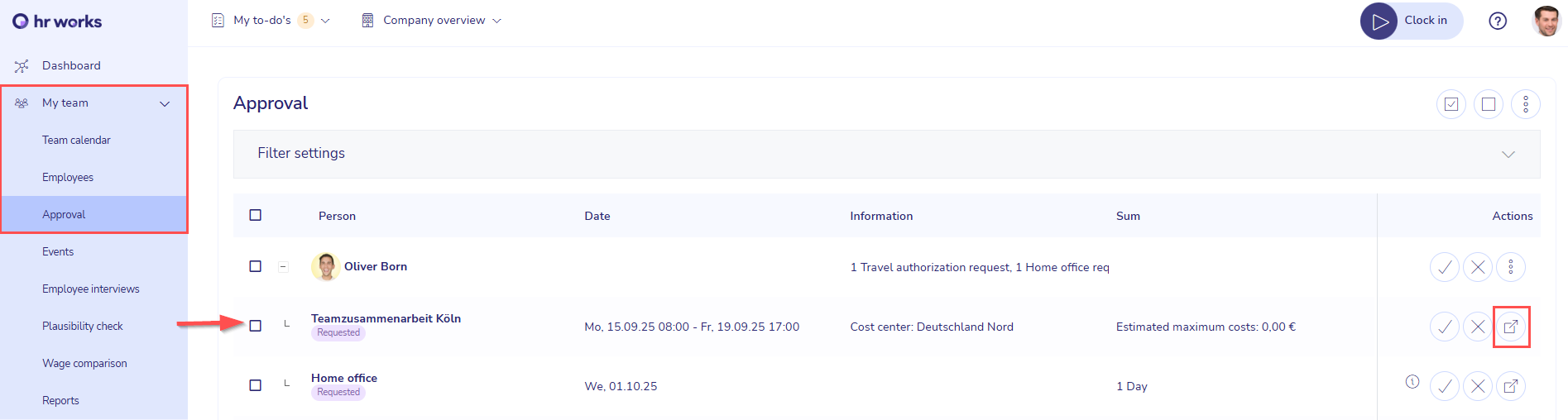 In your user interface, you can approve all requests submitted for approval via the ‘My Team/Approval’ menu. This section provides the most important information about each request.