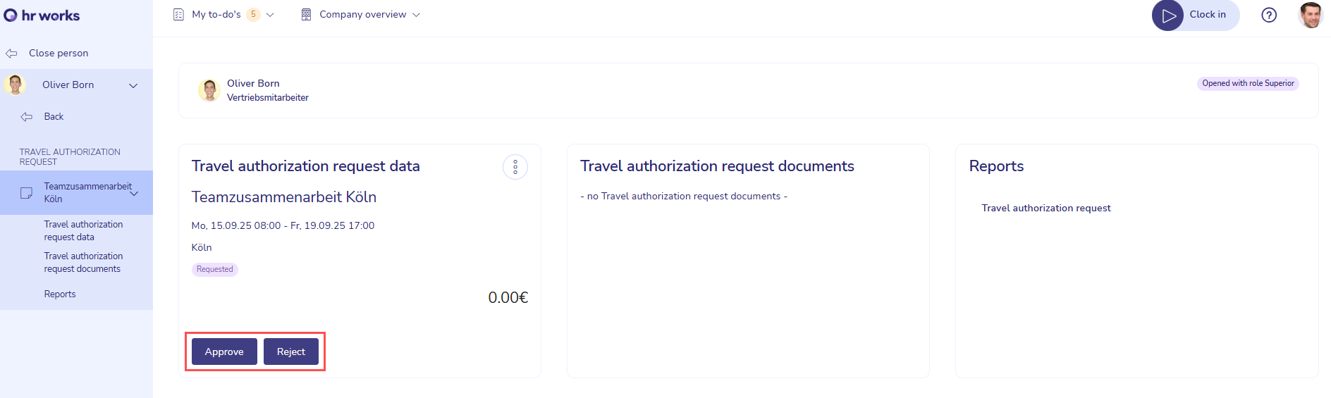 If no other person in your company has been designated as the approver for absences or travel expenses, you, as the superior, are responsible for approving submitted absence and travel authorization requests, as well as travel expense reports for your team.