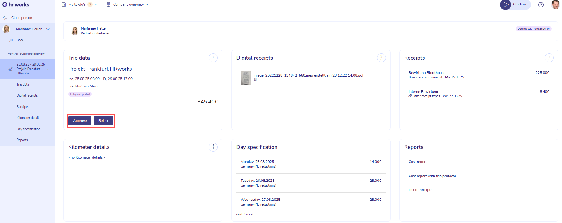 After reviewing, you can then approve or reject the travel expense report in the travel expense report overview. Please note that a travel expense report, including all attached receipts, can only be approved or rejected as a whole — individual receipts or days cannot be approved or rejected separately.