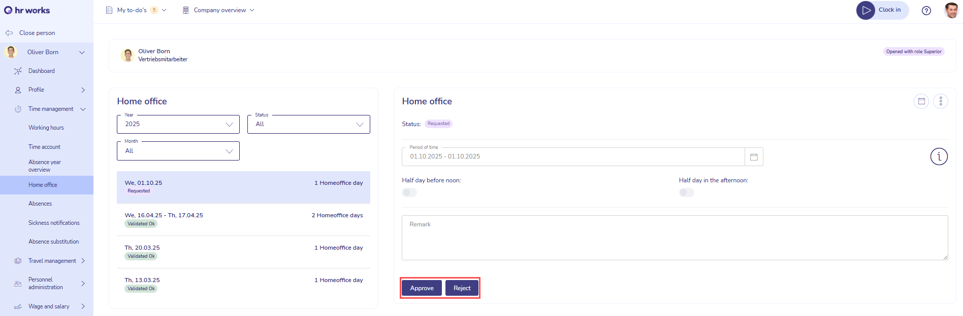 Note: If the administrator has set your employees' permissions so that they are not allowed to approve their own home office requests, the requests will be sent to you, their superior, for approval.