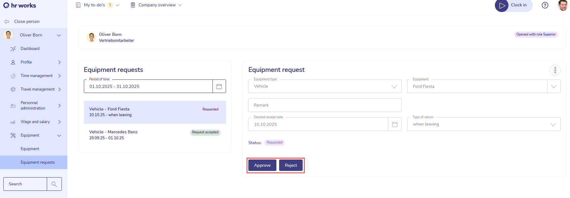 Once an employee has submitted an equipment request through their user interface, you can open the request in a new tab. This will take you to the employee’s equipment requests, where you can approve or reject them. After approval, the administrator is responsible for assigning the equipment for the requested period.