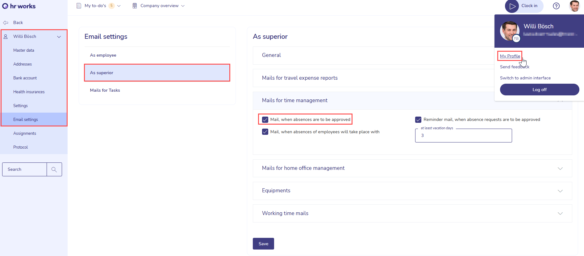 As a superior, you will be notified by email when events are approved. You can manage the settings for approval emails in your user interface under ‘My Profile/Email Settings’ in the ‘As a superior’ section.