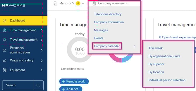 The "Company overview" menu allows you to view all absences of your colleagues - sorted by organizational units, superior, location, by weeks or an individual person selection.