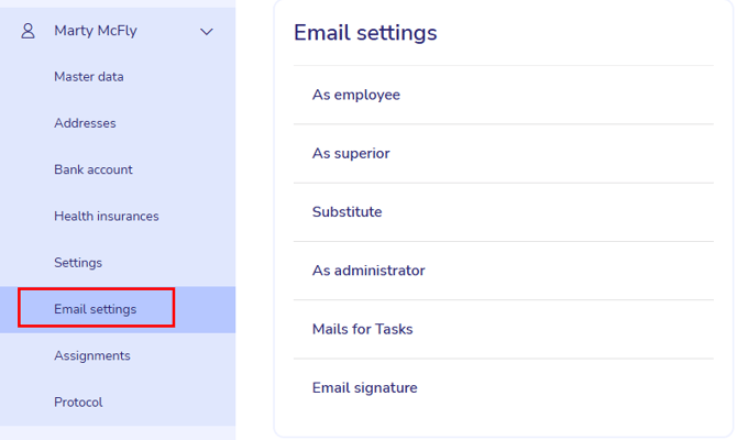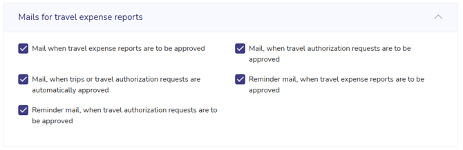 Note: As an approver (travel expense and/or absence approver), you can only view and manage the sections “Emails for travel expense reports” and “Emails for time management.”