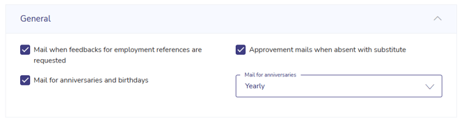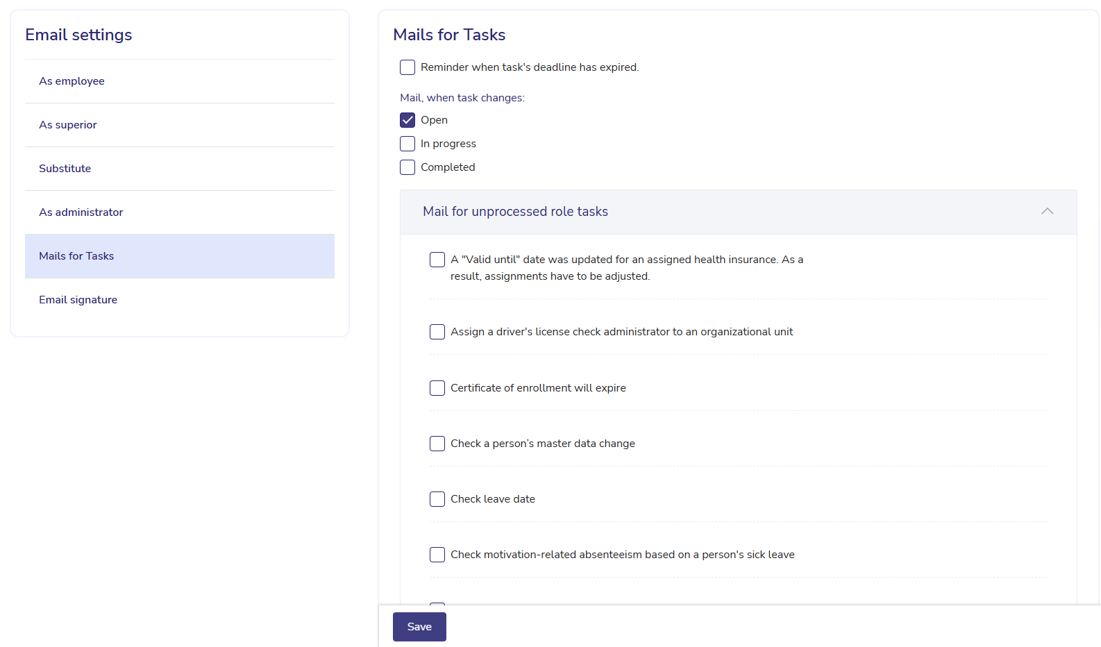 The section “Mails for tasks” is where you manage notifications about tasks from your “To-do” section. Check the box next to the tasks's status you want to be notified about. You can also choose to get emails about open role tasks that come up in connection with your role as a superior (e.g. giving feedback for a job reference).