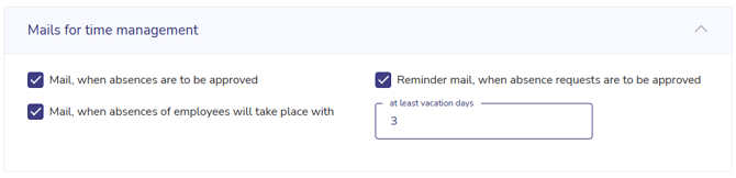In the sevtion “Mails for time management”, you can activate notifications regarding absence requests and associated reminders for pending approvals. You can also activate a notification within your summary email when your employees' absences are due. In the field “at least vacation days”, you can define the length of absence you would like to be notified of.
