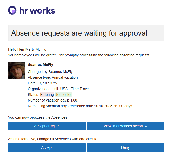 Requests for approval contain the option to approve or reject them directly within the email notification, as well as the option to open the request in the system to view further details. Select the respective option to log in to HR WORKS and to be redirected to the respective function.