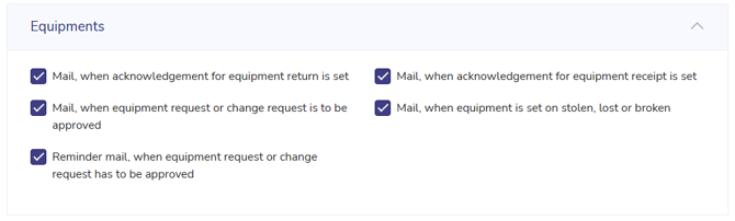 You can be notified of the receipt confirmation, which is carried out by the employee, and the return confirmation, which is carried out by the superior or equipment administrator. You can be notified initially and with a reminder email for approvals of equipment requests and equipment changes. In addition, the checkbox “Mail when equipment is set on stolen, lost or broken” can be activated, which informs you when an employee sets the work equipment to the corresponding status.
