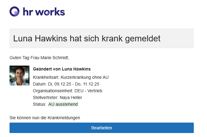 Über die Krankmeldungen Ihrer Mitarbeiter werden Sie als Administrator per E-Mail informiert:
