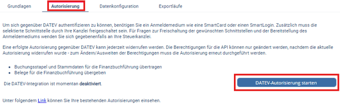 Um die Autorisierung durchzuführen klicken Sie auf “DATEV-Autorisierung starten”. Anschließend öffnet sich ein neues Tab mit der DATEV Login-Seite, auf der Sie sich zunächst mit dem Anmeldemedium authentifizieren. Stimmen Sie anschließend den erforderlichen Berechtigungen zu, um mit der Autorisierung fortfahren zu können.