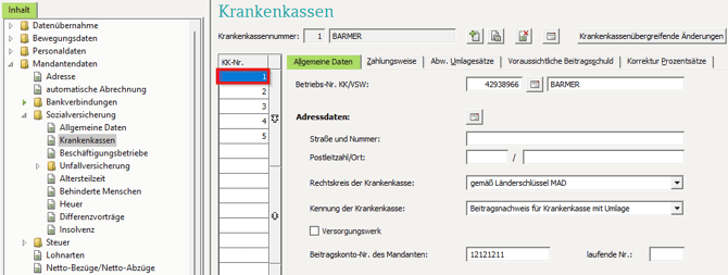 Hinweis: Die einzutragenden Krankenkassennummern sind vor der Übertragung zwingend mit Ihrem Lohnabrechner abzustimmen und zu harmonisieren. Als Unterstützung für den Abgleich und die Harmonisierung der Krankenkassennummern kann auf die im DATEV Daten-Analyse-System (DALY) zur Verfügung gestellte Standardauswertung “Krankenkassenaufstellung” zurückgegriffen werden. Bitte beachten Sie hierbei, dass die Krankenkassen in DATEV bereichsübergreifend zugeordnet sind. Bedeutet, dass die zugehörigen Krankenkassennummern in DATEV über alle Mandanten hinweg eindeutig sein müssen.