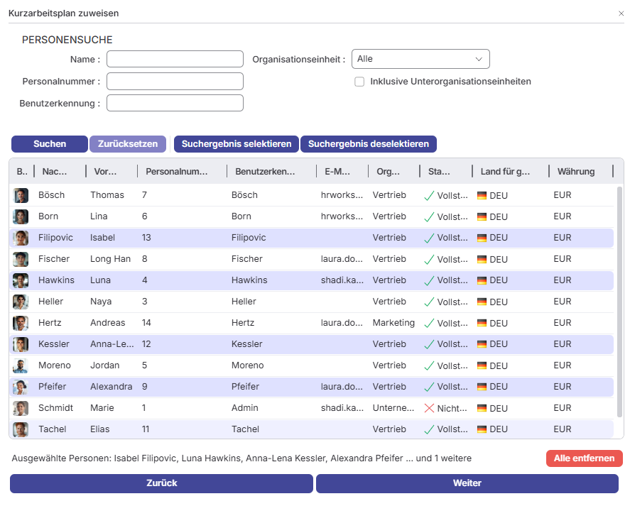 Im zweiten Zuordnungsschritt selektieren Sie die Personen, denen Sie den Kurzarbeitsplan zuordnen möchten. Über die Suchfunktion können Sie zudem gezielt nach einzelnen Personen suchen oder nach Organisationseinheiten filtern.