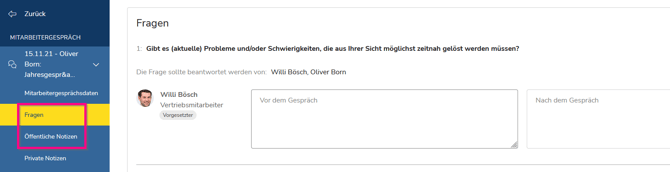Vorgesetzte oder Personalverwaltungs-Administratoren und ihre Mitarbeiter beantworten über den Menüunterpunkt „Fragen und Notizen“ die von Ihnen hinterlegten Fragen und können zusätzlich öffentliche und private Notizen ergänzen. Mit Klick auf „Meine Antworten und öffentliche Notizen freigeben“ veröffentlichen die Teilnehmer ihre verfassten Inhalte an alle Beteiligten. Diese können danach nicht mehr bearbeitet werden. Das Feedback von allen Teilnehmern wird gespeichert und steht Ihnen zur Verfügung.