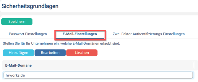 Im Reiter “E-Mail Einstellungen” hinterlegen Sie, welche E-Mail-Domäne beim Anlegen neuer Personen in HR WORKS erlaubt ist. Eine E-Mail-Domäne ist das, was hinter einem @-Zeichen steht.