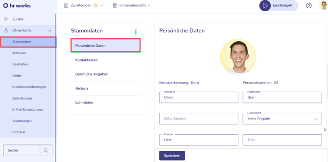 Um die Stammdaten bearbeiten zu können, brauchen Sie zunächst die entsprechende Berechtigung. Sollte die Bearbeitung bei Ihnen nicht möglich sein, wenden Sie sich an Ihren HR WORKS Administrator (diesen finden Sie in der Menüleiste "Firmenübersicht/Firmeninformationen").