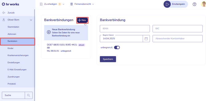 Hat sich Ihre Bankverbindung durch Wechsel der Bank geändert, legen Sie mit Klick auf “Neu” aktuelle Bankdaten an.