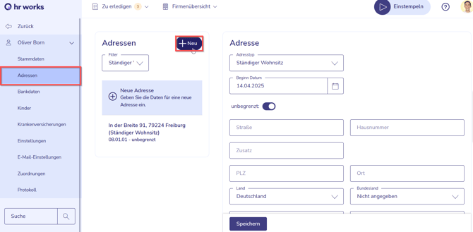 Hat sich Ihre Adresse geändert oder möchten Sie eine neue anlegen, wählen Sie den Button “Neu”. Tragen Sie hier alle erforderlichen Daten ein und speichern Sie den Vorgang.