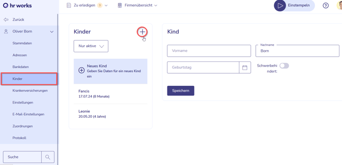 Das Hinzufügen von Kindern, zu den Stammdaten eines Mitarbeiters, kann ebenfalls von Ihnen durchgeführt werden.