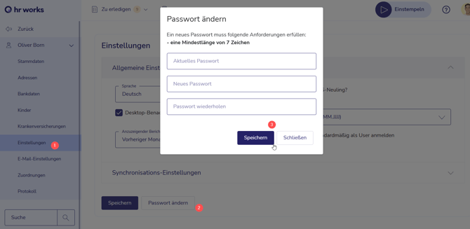 Sofern Sie Ihr Passwort ändern möchten oder dazu aufgefordert wurden, können Sie dies im Menüpunkt "Einstellungen" vornehmen. Mit Klick auf "Passwort ändern" wird das Eingabefenster zum Einrichten des neuen Passworts geöffnet. Geben Sie das aktuelle Passwort ein, sowie das Neue und speichern Sie die Änderung ab.