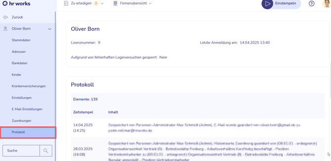 Eine Zusammenfassung aller vorgenommenen Änderungen, sortiert nach Datum, Uhrzeit und Person, finden Sie im Menüunterpunkt “Protokoll”.