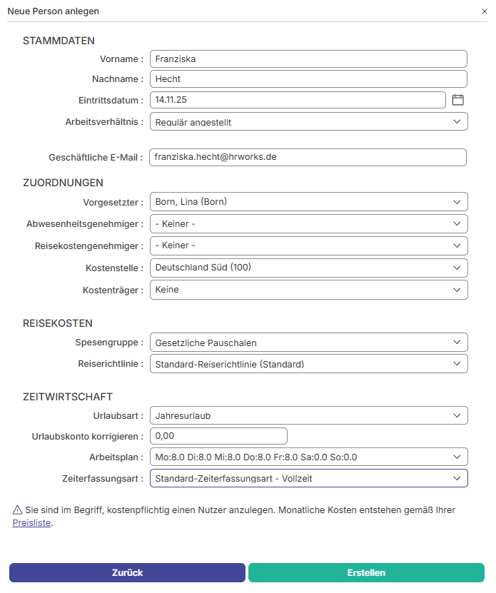 Hinweis: Sofern Sie den Button "Erstellen" auswählen, legen Sie die neue Person kostenpflichtig im HR WORKS System an.