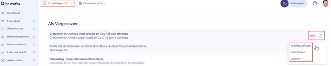 Für Geburtstage und Jubiläen erhalten Sie als Vorgesetzten-Person eine Aufgabe zur Gratulation beim Eintreten des Ereignisses. Diese wird Ihnen in Ihrem "zu erledigen" Bereich unter "Systemaufgaben/Als Vorgesetzter" aufgeführt. Klicken Sie auf das Drei-Punkte-Menü, um die Aufgabe in Arbeit zunehmen und abzuschließen.