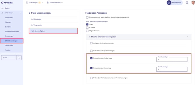 In der Rubrik "Mails über Aufgaben" können Sie einstellen, dass Sie über die Aufgabe zur Gratulation per E-Mail benachrichtigt werden, indem Sie die Benachrichtigung zu "Gratulation zum Geburtstag" als auch "Gratulation zum Jubiläum" aktivieren. Zusätzlich können Sie definieren, nach welchen Anzahl an Tagen die Benachrichtigung versendet werden soll. "0" bedeutet hier Versand direkt nach Erstellung der Aufgabe. "1" bedeutet dementsprechend ein Versand, nachdem die Aufgabe seit einem Tag offen ist. Mit Klick auf "Speichern" sichern Sie die Änderung.