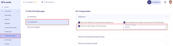 Innerhalb Ihres Profils können Sie unter "E-Mail Einstellungen" die Rubrik "Als Vorgesetzter" öffnen. Klappen Sie die Kachel "Allgemein" auf und setzen den Haken bei "Mails über Geburtstage und Firmenjubiläen". Hierdurch erhalten Sie einen Hinweis in Ihrer wöchentlichen Zusammenfassungsmail, welche Sie montags in der Woche vor Eintritt des Ereignis erhalten.
